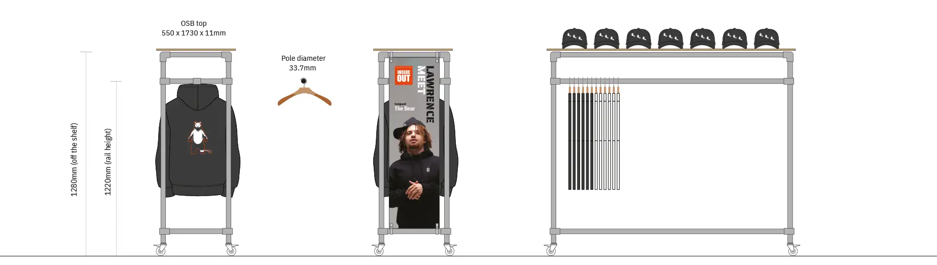 Inside Out took on a retail unit in Westfield Stratford to capitalise on the Christmas period. Uncle designed and built an impactful pop-up retail space using existing store infrastructure, introducing raw tactile materials and large wall vinyls. We also built clothing rails made from scaffolding poles, for easy reuse.
